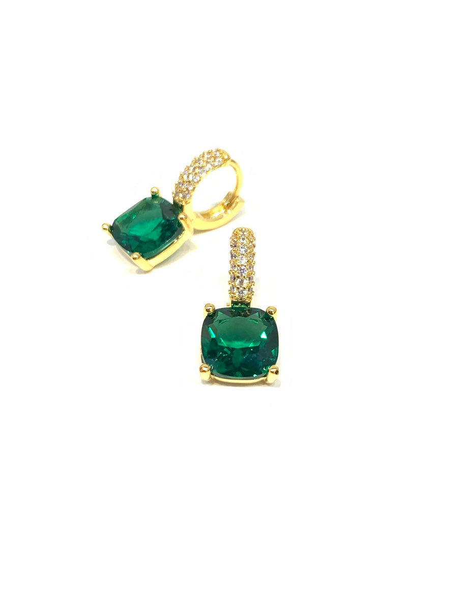 Hooped stud earrings with hand set cushion cut high quality CZ with a Gold finish and starring an Emerald.