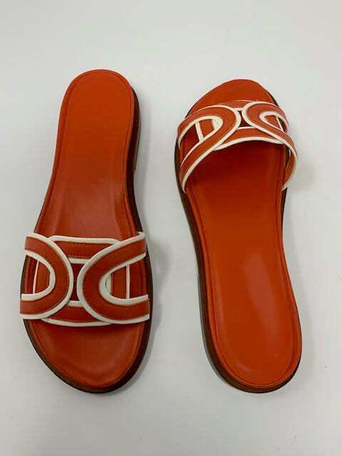Step into elegance with our stunning orange sandals featuring crisp white piping. Crafted with meticulous attention to detail, these sandals are designed to add a touch of sophistication to any ensemble. Whether you're strolling along the beach or attending a summer soirée, these sandals will effortlessly elevate your look. Made in Spain.